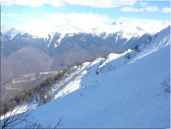 Сюда можно подняться на подъемнике с Розы Долины. На территории находится учебный склон для полных новичков и школа зимних видов спорта. Здесь вас за пару дней научат сносно кататься на сноуборде или лыжах. Внимательные инструктора творят чудеса.