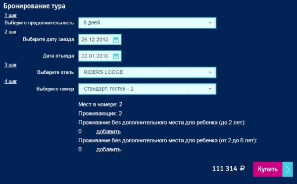 На официальном сайте Вы пока еще можете выбрать себе тур на Новогодние праздники, например, вот такой тур на 8 дней за 111 314 рублей за двоих: