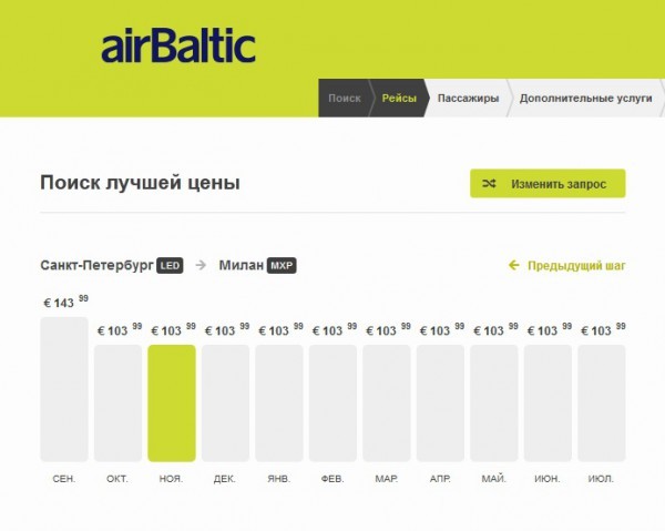 Стоимость отличается в зависимости от того, из какого города Вы планируете вылет. Так, например, прямой перелет в Милан из Риги обойдется всего в 49 евро. Не верите, зайдите на сайт авиакомпании и сами убедитесь в этом: