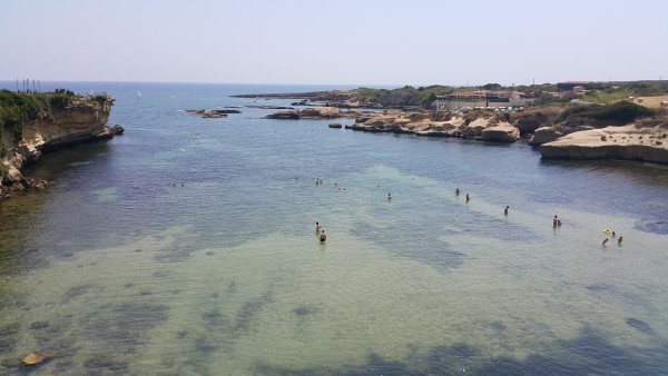 Маленькая глубина и форма бухты позволяют купаться не мешая друг другу. Вода прогревается хорошо. Красивый цвет , как я уже писала в статьях цикла о Сицилии, не так романтичен в жизни. Темные участки в воде — водоросли, которые все пытаются обойти стороной.