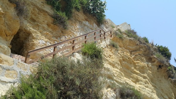 Пляж представляет собой закрытую бухту между скалами, с двух сторон по бокам на него можно спуститься по лестнице, для постояльцев отеля — отдельный вход, но об этом чуть позже.