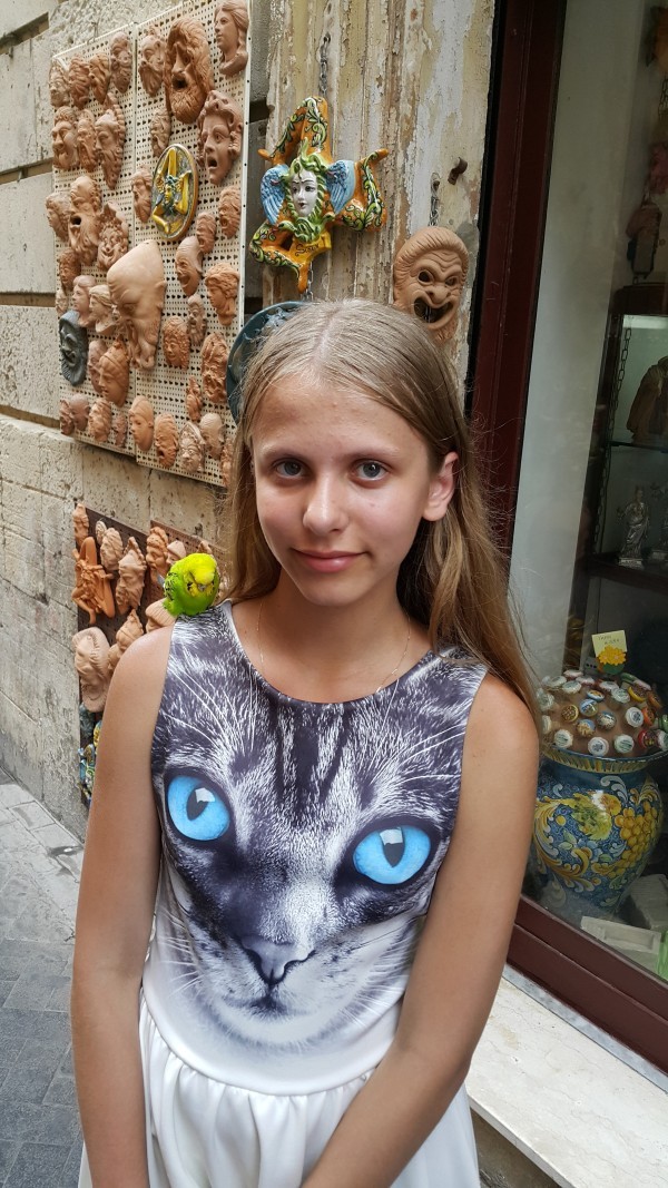 А на фото снизу моя дочка держит на плече попугая, так вот в Сиракузах попугаи это отдельная тема. Рассказывая о самом популярном курорте Сицилии, я подробно описывала две основные проблемы курорта:медузы и тайские массажистки, так вот в Сиракузах нет ни того ни другого, что не удивительно, так как пляжа тоже нет, зато есть бесконечные попугаи с назойливыми хозяевами , выманивающими деньги. Ну, допустим разок сфотографировала я дочку на плече с зеленой птичкой, и то, под вопросом, надо ли оно нам было за 5 евро?! Но через пару минут ей на плечо снова пристроили птичку и стали требовать деньги, мы ничего не дали и уже стали шарахаться от людей с попугаями. Но пока мы зашли в магазин с дочкой, к моему супругу, который остался на улице пристали не на шутку. Птицу начали сажать то на плечо, то на руку и никак не собирались оставить его в покое , пока он просто не крикнул на приставучую женщину с клеткой. Вообщем, держите руку на пульсе, а то на каждом перекрестке будете платить за сомнительное удовольствие.