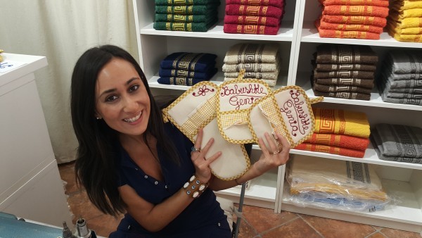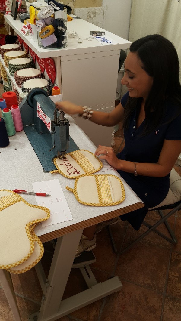 Совсем рядом с центром на одной из улочек разместилась мастерица, которая прямо на ваших глазах делает именными любой выбранный казалось бы обычный подарок. Бабушкам были выбраны прихватки , с надписями «Бабушке Жене», «Деду» и «Буле»: