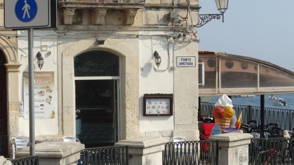 На доме на углу — скромная табличка Fontane Aretusa:
