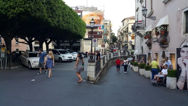 Прогулка по старому городу Таормины напомнила мне вечер на Невском проспекте в Санкт-Петербурге. Для тех, кто не бывал в Северной столице объясню , что Невский проспект — это главная улица. На Невском и вблизи сосредоточены самые дорогие рестораны, музеи, театры , посещаемые туристами и жителями города достопримечательности. Концентрация людей зашкаливает по вечерам. Да и в выходные зашкаливает настолько , что вместо того, чтобы лицезреть красоту по сторонам , начинаешь думать как бы обогнать эту неторопливую даму и протиснуться между веселой компании.