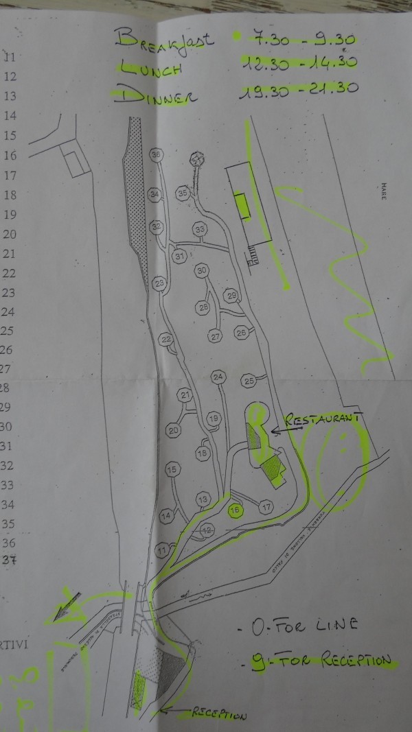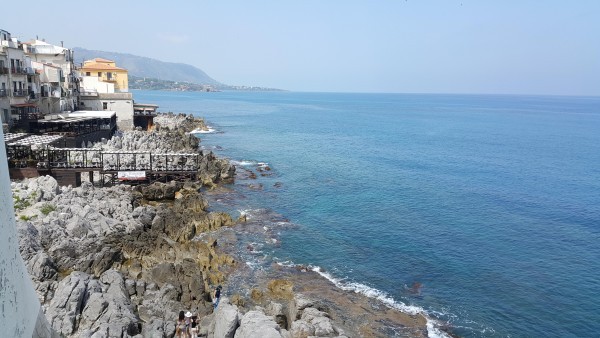 Приехали мы поздней ночью после дальнего перелета, поэтому в темноте и изрядно вымотавшись , мы не стали всматриваться в потемках и оставили наслаждение увиденным на утро. В тишине ночью было слышно только как волны шумят и ласково бьются о камни, ни о каком шторме речи не было, но приятный звук ласкал слух. Предупредительно приготовленная нам бутылка вина была очень кстати и несмотря на усталость и на то, что время неумолимо близилось к рассветному часу, мы выпили сицилийского напитка и легли спать в предвкушении…