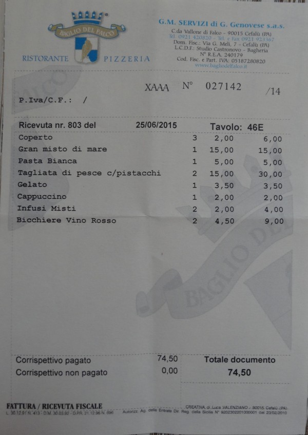 Теперь что касается стоимости ужина: мы заказали макароны с сыром и мороженное дочке, а себе по бокалу красного вина, рыбное ассорти (порция на двоих) в качестве первого блюда и тунец на гриле в качестве второго, кроме того нам принесли хлеб и чай. Ужин обошелся в 74,5 евро. Этого было даже много, так как тунец оказался, как я и говорила очень сытным блюдом.