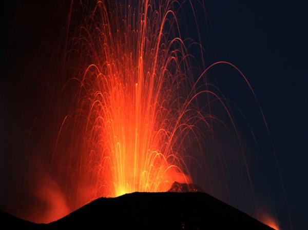 Стромболианский тип извержения: вязкая лава с разной интенсивностью выбросов извергается вверх фейерверками и вулканическими бомбами( продуктами застывшей лав разных диаметров). Этот тип вулкана назван в честь вулкана Стромболи, расположенного на Липарских островах севернее Сицилии.В своем путешествии мы посетили соседних остров Липарских островов — Вулкано, на котором тоже располагается действующий вулкан с одноименным названием.
