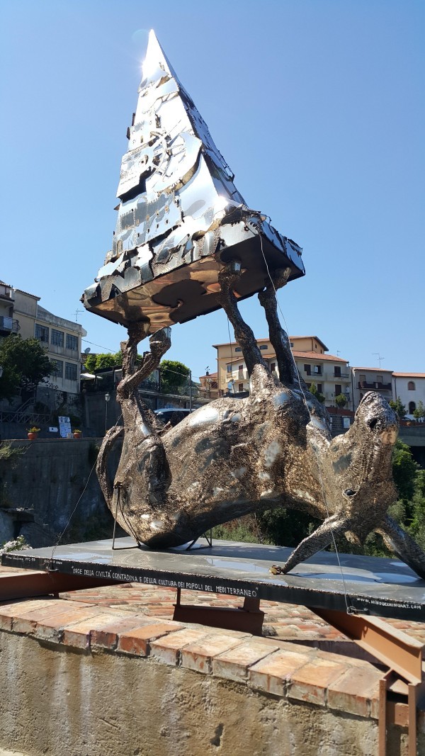 На подъезде в деревню Вас встретит причудливая экспозиция в виде ослика, держащего на своих ногах Сицилию. Сицилию в древности греки называли Тринакрия(Trinacria) из за ее треугольной формы. Интерпретировать творение художника можно и как бедного ослика , который стал никому не нужен после того как трудолюбивых животных на острове заменили техникой и транспортом, но это по российскому менталитету, а по мнению сицилийцев ослик, напротив, очень счастлив, так как ему больше не нужно работать, а можно отдыхать и наслаждаться жизнью.