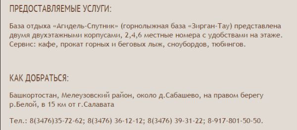 Зирган-Тау горнолыжный курорт цены предлагает лояльные. Отдых для всей семьи обойдется в несколько тысяч рублей. Подробную информацию о курорте и цены уточняйте по телефону у администрации +7 (34763) 9-31-22.